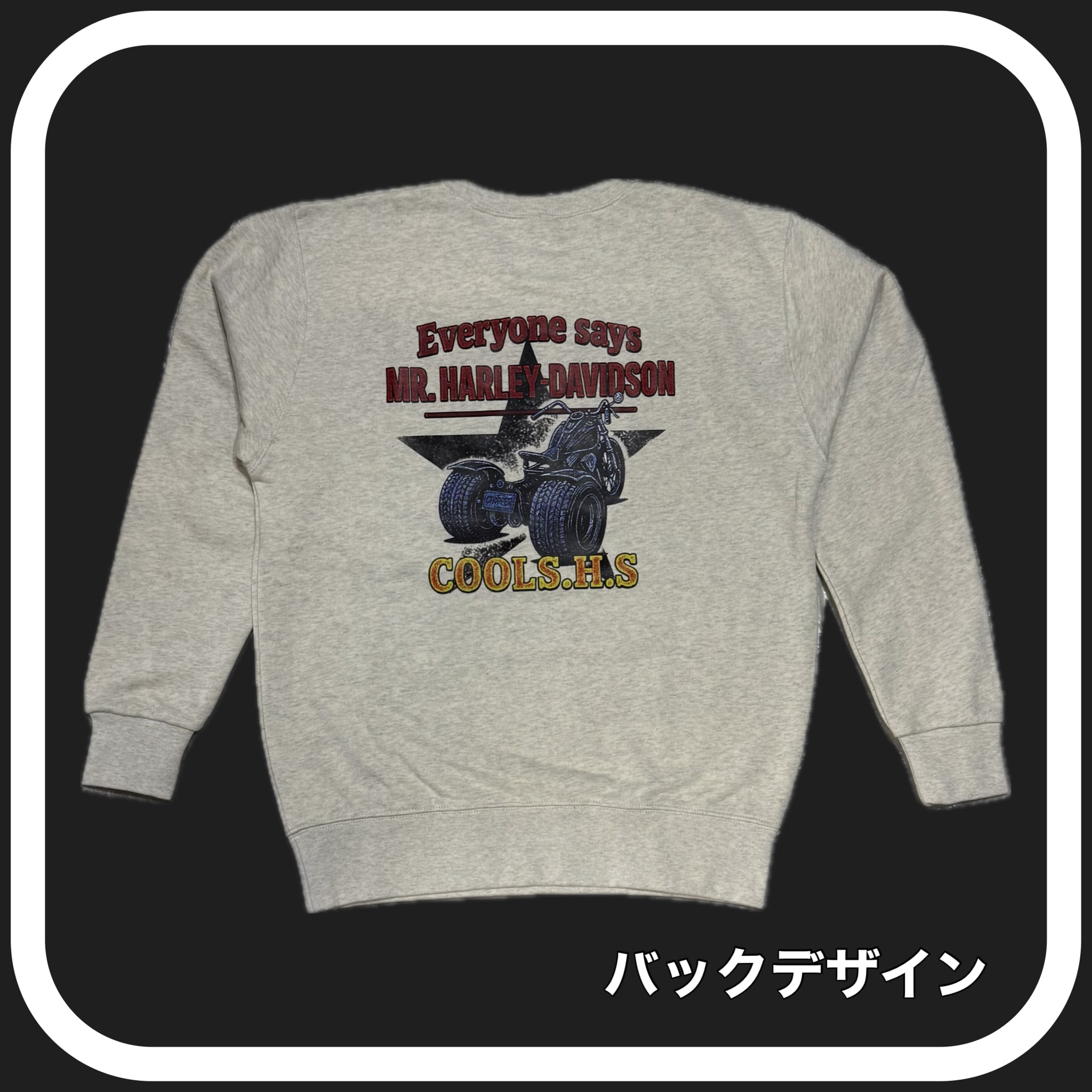 背中のバイクデザインが印象的なトレーナー。